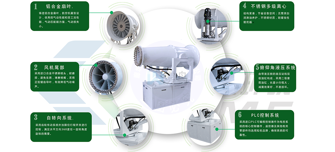 6、功轉換效率高、射程遠、覆蓋面積大、霧粒細小且均勻、抑塵效果好。水霧與飄在空中的塵埃接觸時,被塵埃所吸附,加大塵埃的比重,抑制塵埃在空氣中的流動,并加速塵埃沉降,實現對空氣的凈化。