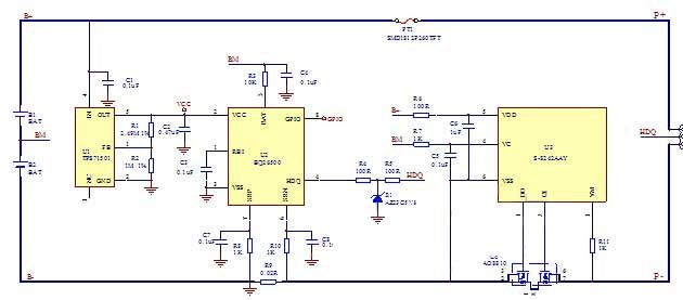 6)電量管理控制芯片(BQ26500):功能完整的電量檢測計,具有一個測量電壓與溫度的模數轉換器(ADC) 和一個測量電流與充電感測的模數轉換器。電量檢測計具有一個微處理器,負責執行電量檢測計,能夠提供剩余電量狀態(Remaining State of Capacity)等信息,BQ26500產品還提供剩余可運行時間 (Run Time to Empty)。主機可隨時向電量檢測計查詢這些信息,將電池信息通知用戶。電量檢測計的使用非常方便。讓使用者隨時掌握電池電能。